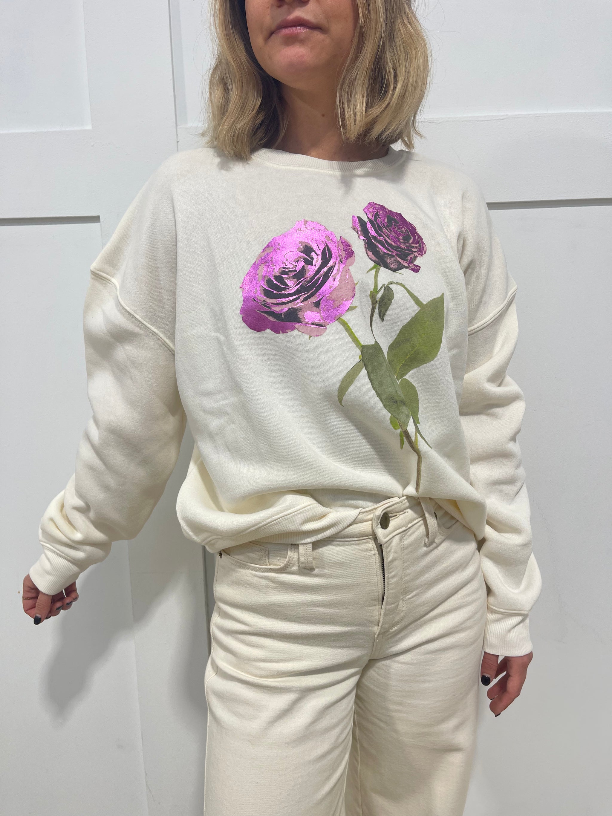 Soft, romantic, and effortlessly chic—this pullover brings a touch of shine to your everyday style. Designed on a creamy backdrop, it features elegant rose stems accented with shimmering pink foil detailing that catches the light just right. With its cozy feel and timeless florals, this sweatshirt is perfect for adding a little sweetness (and sparkle) to your casual lineup.